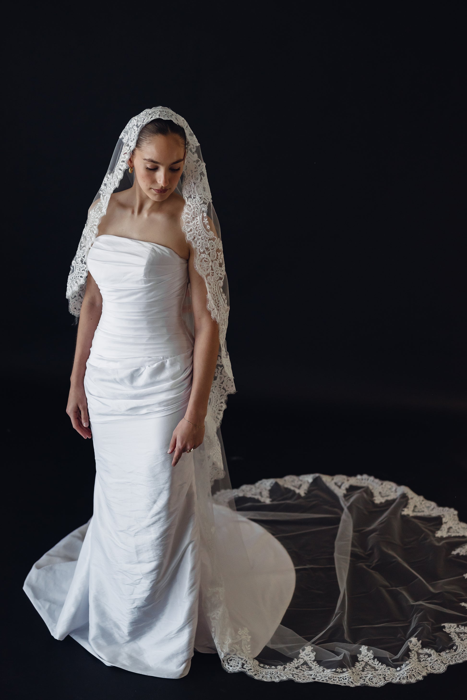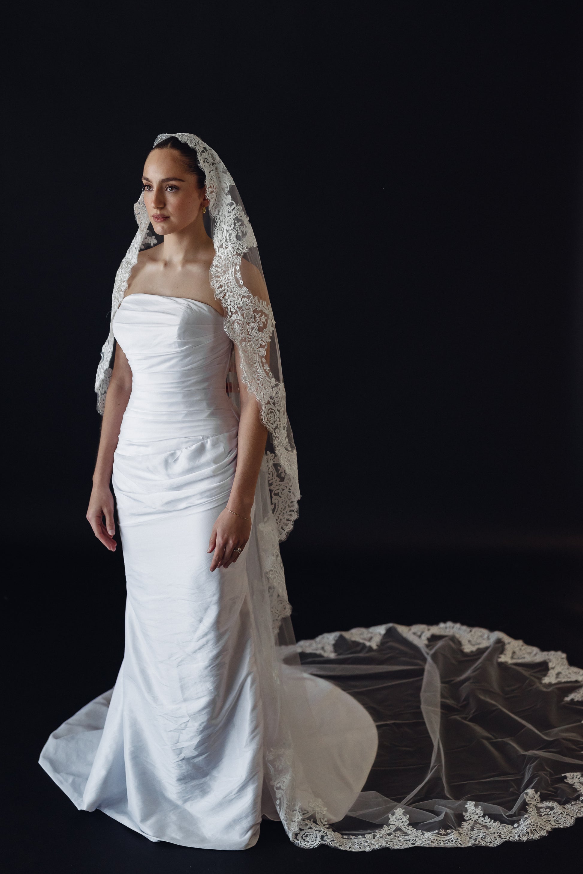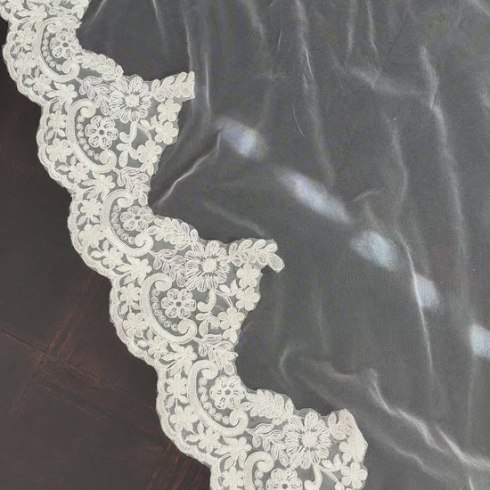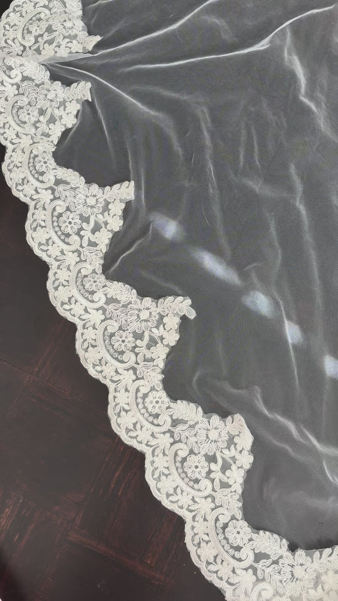 Our European veil, adorned with luxurious thick Italian lace, is truly the statement piece of this wedding season. Designed to embody timeless romance and modern sophistication, this veil drapes effortlessly to complement any bridal look. The delicate lace detailing adds depth and texture, while the soft tulle creates a graceful flow that moves beautifully with every step.